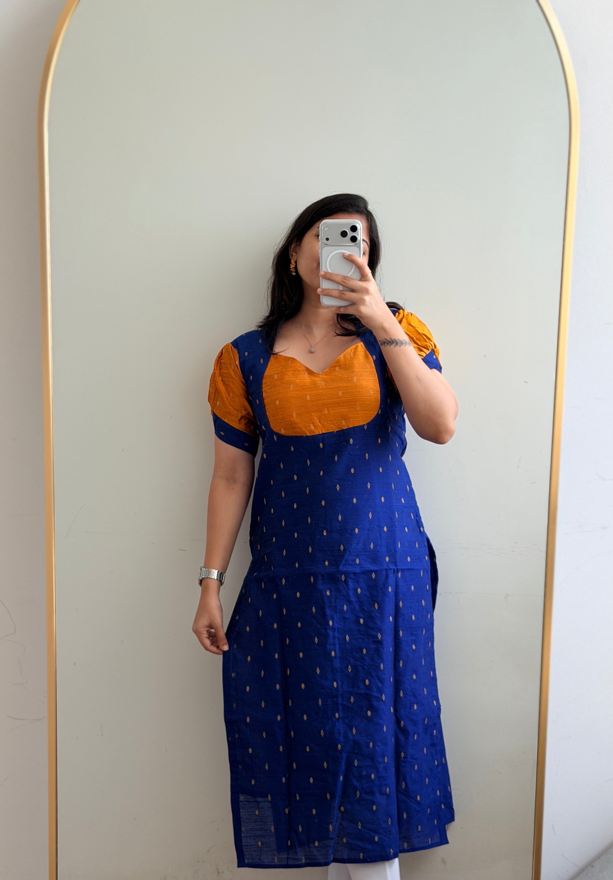Step into subtle sophistication with our Blue with Yellow Raw silk Kurti, crafted from premium raw silk fabric that feels luxuriously smooth and lightweight on the skin. Designed in an elegant ink blue base with delicate golden butti patterns, this kurti perfectly balances tradition and modern grace. The structured square neckline and puffed sleeves add a refined touch, making it ideal for workwear, festive gatherings, or casual outings. Pair it with leggings or straight pants for an effortlessly chic look!