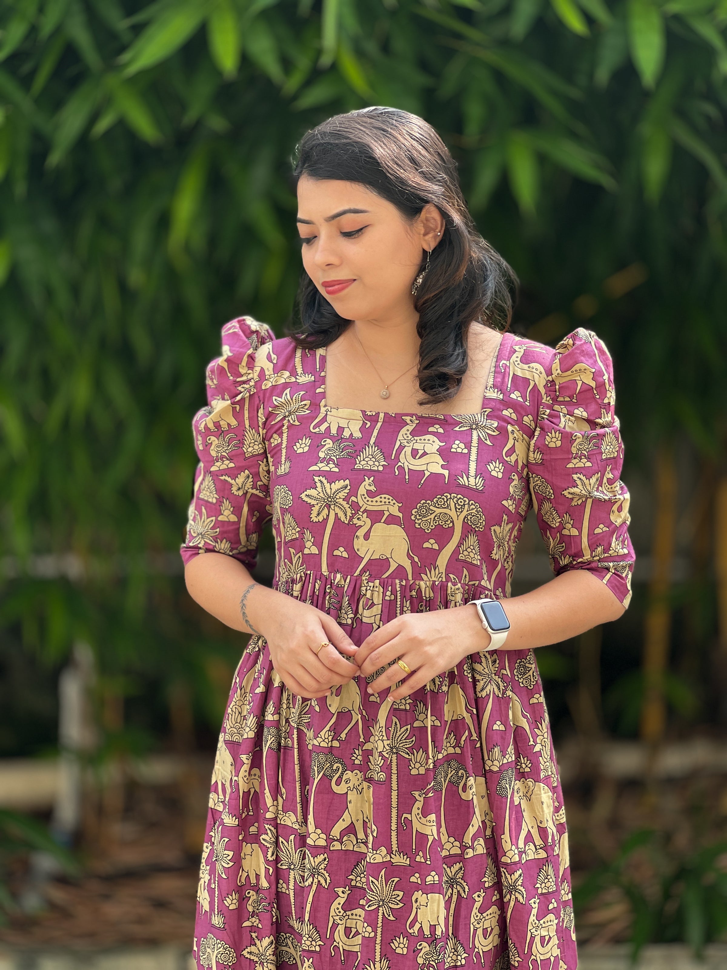A royal mauve-toned cotton maxi that tells stories of nature through its intricate elephant and palm prints. The structured puff sleeves and adjustable back tie make it both flattering and functional. A perfect pick for gatherings, festive evenings, or casual elegance.